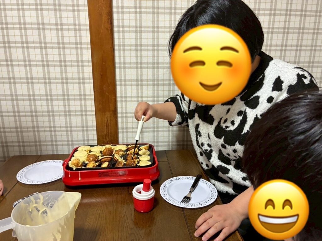お兄さんが先生と一緒にベビーカステラの生地をくるくる回して焼いてくれています。(*’▽’)