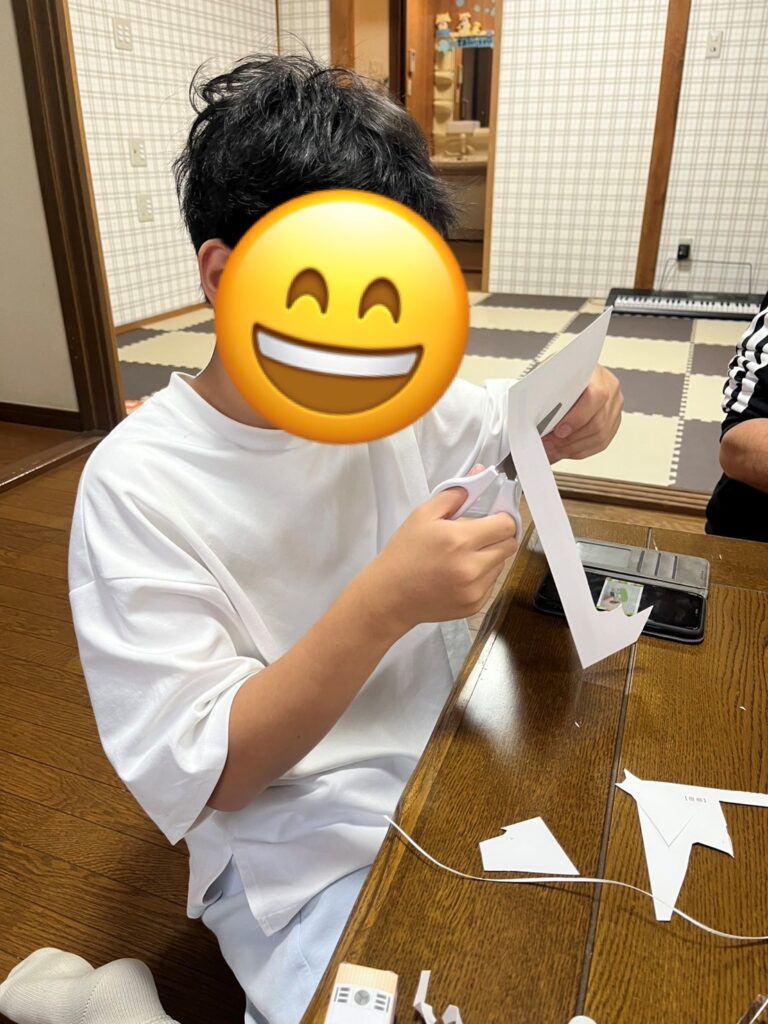 好きな電車のペーパークラフトを工作。上手にはさみとノリで作ることができました(o^―^o)