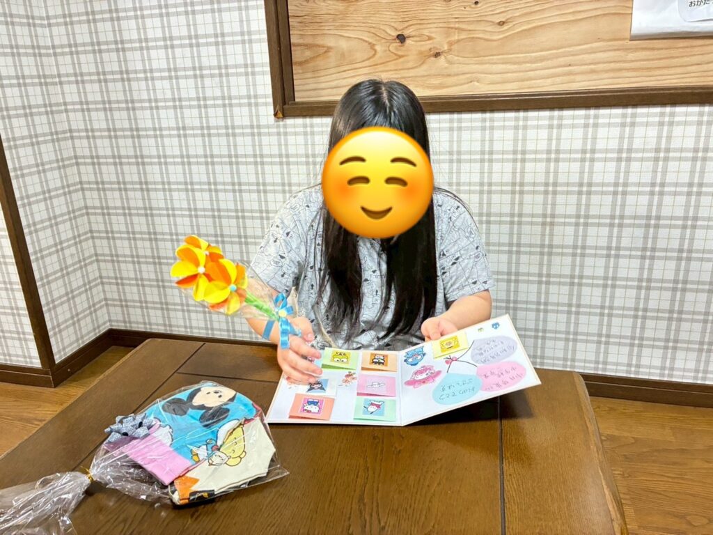 色紙を開いて、先生たちからのメッセージをいっしょにみています。