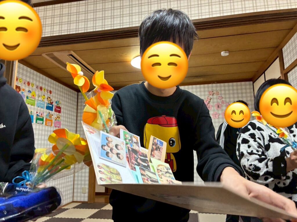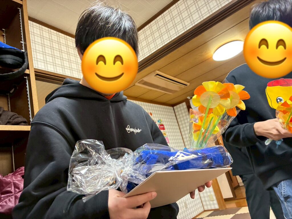 今年3月に中学校を卒業したお兄さん、お姉さん達に、先生たちから手作りの花束と色紙と記念品をお渡しして、みんなでお祝いをしました。